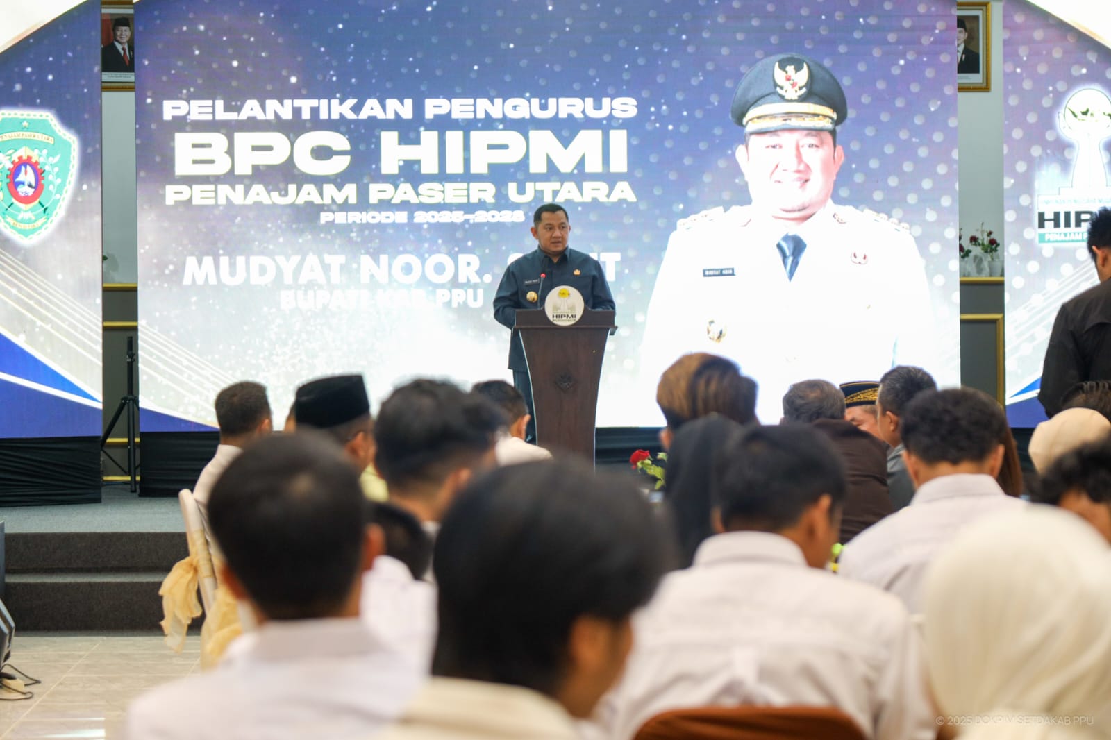 PENAJAM — Bupati Penajam Paser Utara (PPU), Mudyat Noor menghadiri pelantikan Badan Pengurus Cabang (BPC) Himpunan Pengusaha Muda Indonesia (HIPMI) Kabupaten PPU periode 2025–2028 di Rich Function Hall, Kampung Inggris Sansis, Kelurahan Lawe-Lawe, Senin (11/08/2025).