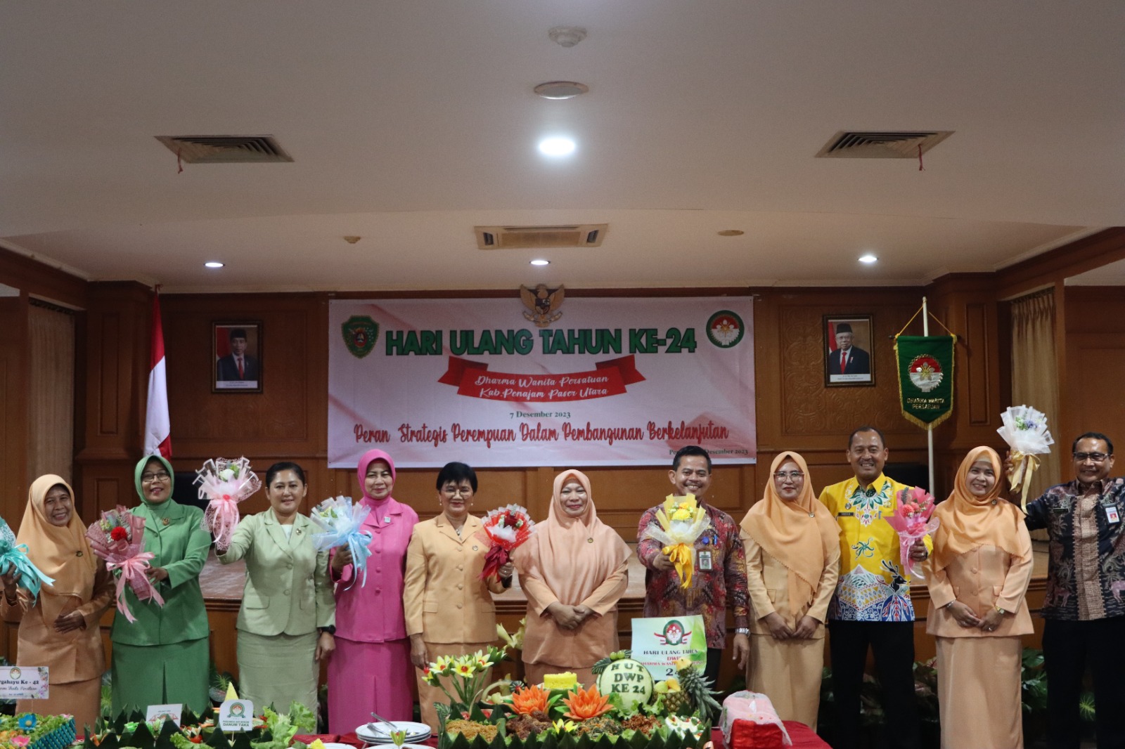 PENAJAM – Dharma Wanita Persatuan (DWP) Kabupaten Penajam Paser Utara (PPU) menggelar acara peringatan Hari Ulang Tahun (HUT) Ke-24 DWP bertempat di Aula Lantai I Kantor Bupati PPU pada Jumat (15/12/23). Acara yang mengusung tema ‘Peran Strategis Perempuan Dalam Pembangunan Berkelanjutan’ dihadiri oleh Sekretaris Daerah PPU Tohar, Penjabat Penasehat DWP Kabupaten PPU Linda Romauli Siregar, Asisten Bidang Pemerintahan dan Kesra Sekretariat Daerah (Setda) PPU Sodikin, Kepala Dinas Pemberdayaan Perempuan, Perlindungan Anak,Pengendalian Penduduk dan Keluarga Berencana (DP3AP2KB) PPU Chairur Rozikin, Ketua Persit Kartika Chandra Kirana Kabupaten PPU, Ketua Bhayangkari Kabupaten PPU, Ketua Ikatan Adhyaksa Dharmakarini Kabupaten PPU, Ketua Dharmayukti Karini Kabupaten PPU, Ketua DWP Perangkat Daerah di lingkungan pemerintahan Kabupaten PPU, Ketua DWP instansi vertikal dan Ketua DWP kecamatan se-Kabupaten PPU.