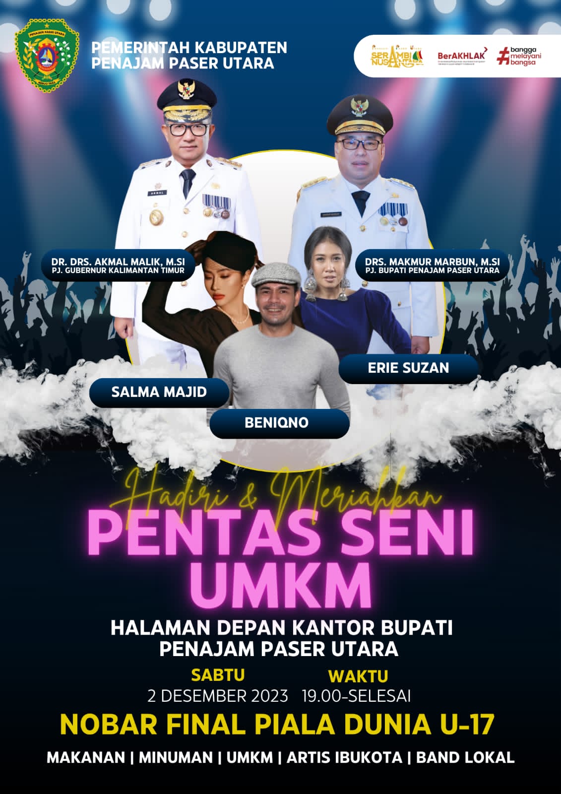 Sabtu malam (2/12/2023) akhir pekan ini, panitia pelaksana akan menghadirkan artis dangdut ibu kota yaitu Benigno, Erie Suzan dan Salma Majid untuk menghibur masyarakat PPU. Makmur Marbun juga menyampaikan bahwa Pj Gubernur Kalimantan Timur (Kaltim) Akmal Malik akan turut hadir dalam malam Pentas Seni dan UMKM malam nanti bersama masyarakat PPU.