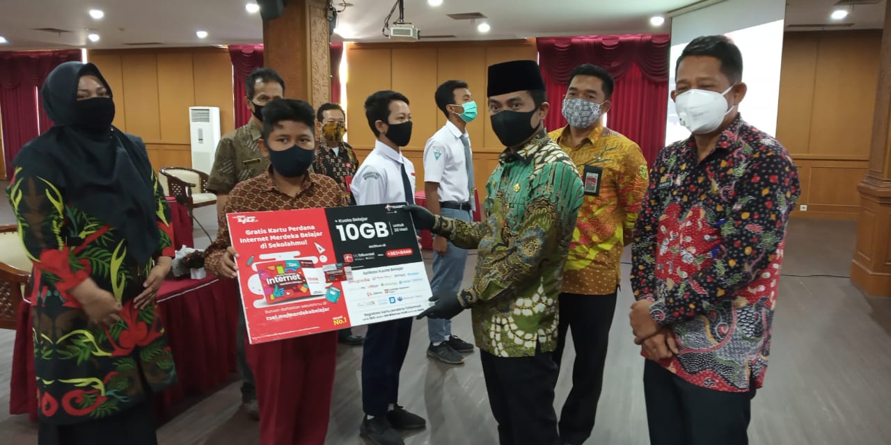 Penajam,- Bupati Penajam Paser Utara (PPU) Abdul Gafur Mas’ud (AGM) di dampingi Kepala Dinas Pendidikan Pemuda dan Olahraga (Disdikpora) Alimudin dan Kepala Dinas Komunikasi dan Informatika (Diskominfo) Budi Santoso, menyerahkan secara simbolis kartu perdana internet Merdeka Belajar Jarak Jauh (MBJJ) kepada 4 perwakilan siswa serta 1 orang guru di Aula Lantai 1 Kantor Bupati, Kamis (10/09/2020).