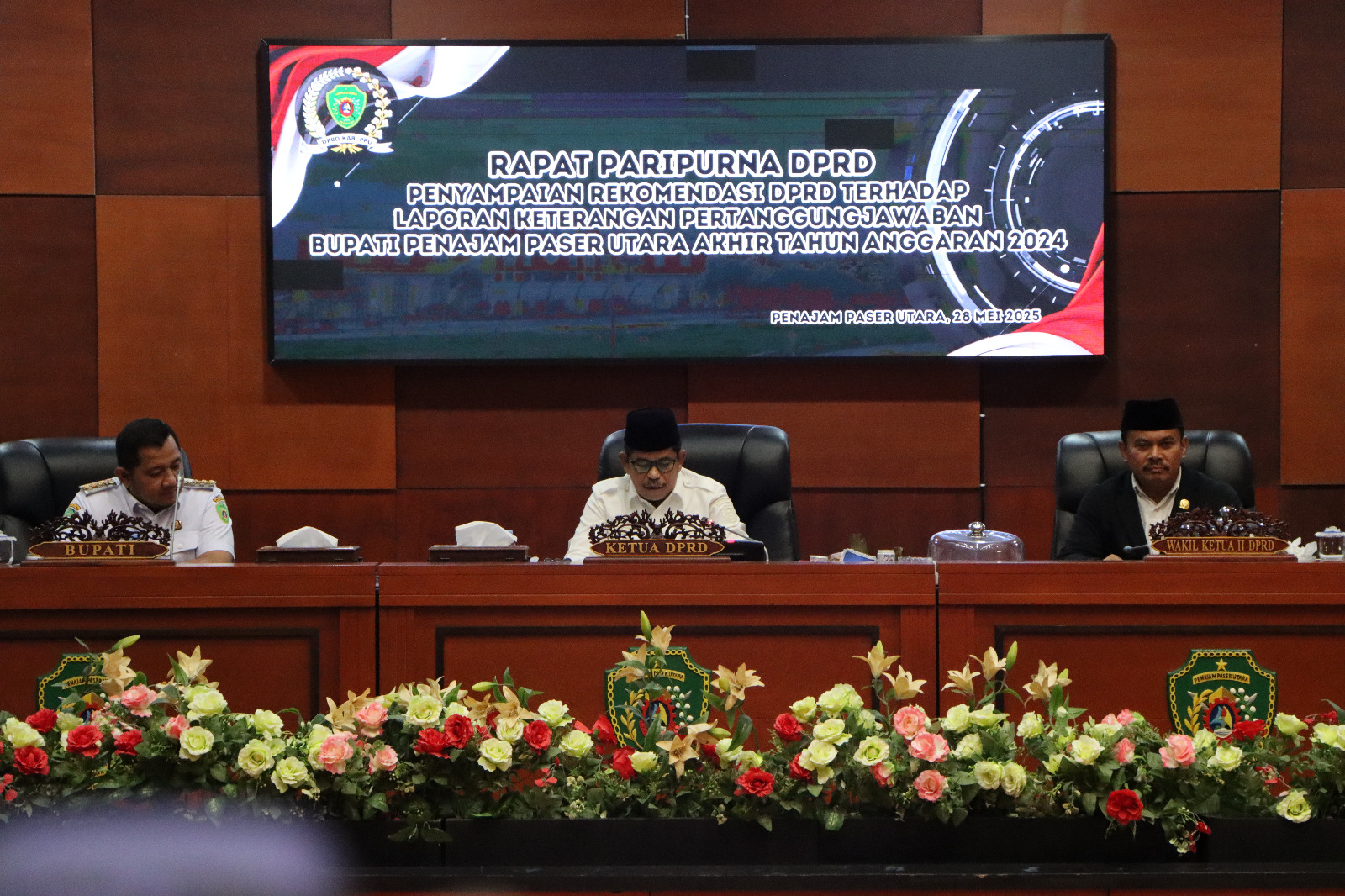 Penajam – Bupati Penajam Paser Utara (PPU) menghadiri rapat paripurna penyampaian rekomendasi Dewan Perwakilan Rakyat Daerah (DPRD) terhadap laporan keterangan pertanggungjawaban (LKPJ) Bupati PPU tahun anggaran 2024. Agenda dilaksanakan di Gedung Sidang Paripurna DPRD PPU, Rabu (28/5/2025) sore.