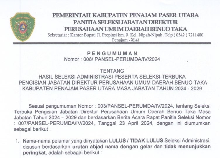 Pengumuman Hasil Seleksi Administrasi Peserta Seleksi Terbuka Pengisian Jabatan Direktur Perumda Benuo Taka Masa Jabatan Tahun 2024-2029