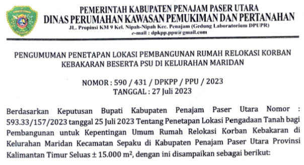 Pengumuman Penetapan Lokasi Pembangunan Rumah Relokasi Korban Kebakaran Beserta PSU di Kelurahan Maridan