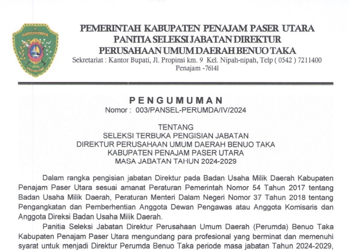 Pengumuman Seleksi Terbuka Pengisian Jabatan Direktur Perusahaan Umum Daerah Benuo Taka Kabupaten Penajam Paser Utara Masa Jabatan Tahun 2024-2029