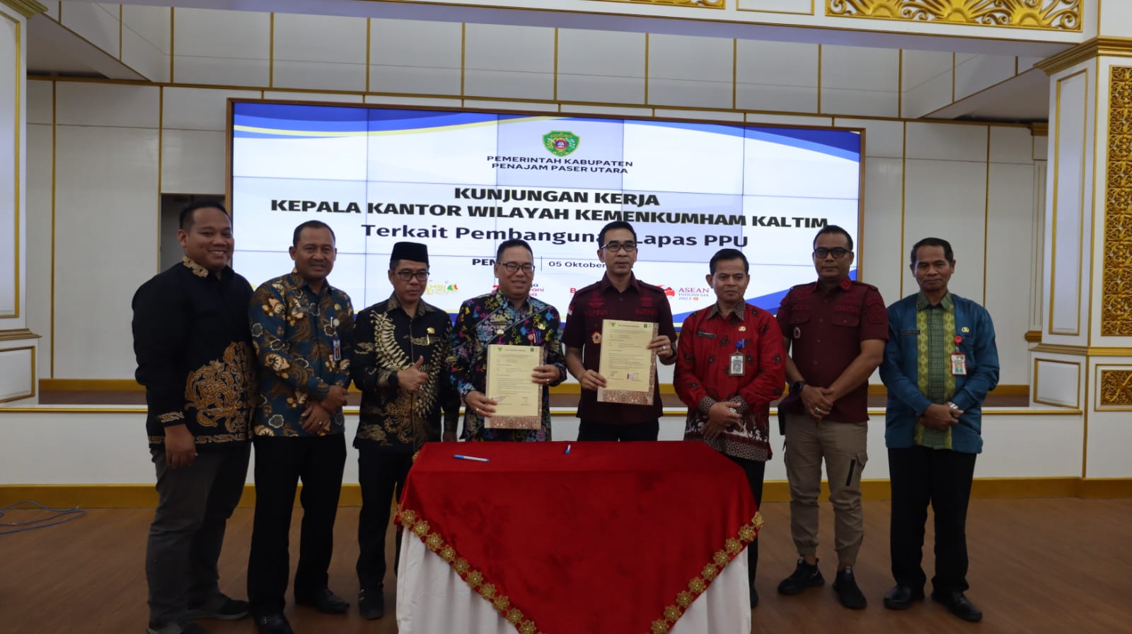 Penajam – Pemerintah Kabupaten (Pemkab) Penajam Paser Utara (PPU) melakukan penandatanganan naskah bersama Kantor Wilayah (Kanwil) Kementerian Hukum dan Hak Asasi Manusia (Kemenkumham) Kalimantan Timur (Kaltim) terkait pembangunan Lapas (Lembaga Pemasyarakatan) di aula lantai III Kantor Bupati PPU, Kamis (05/102023).