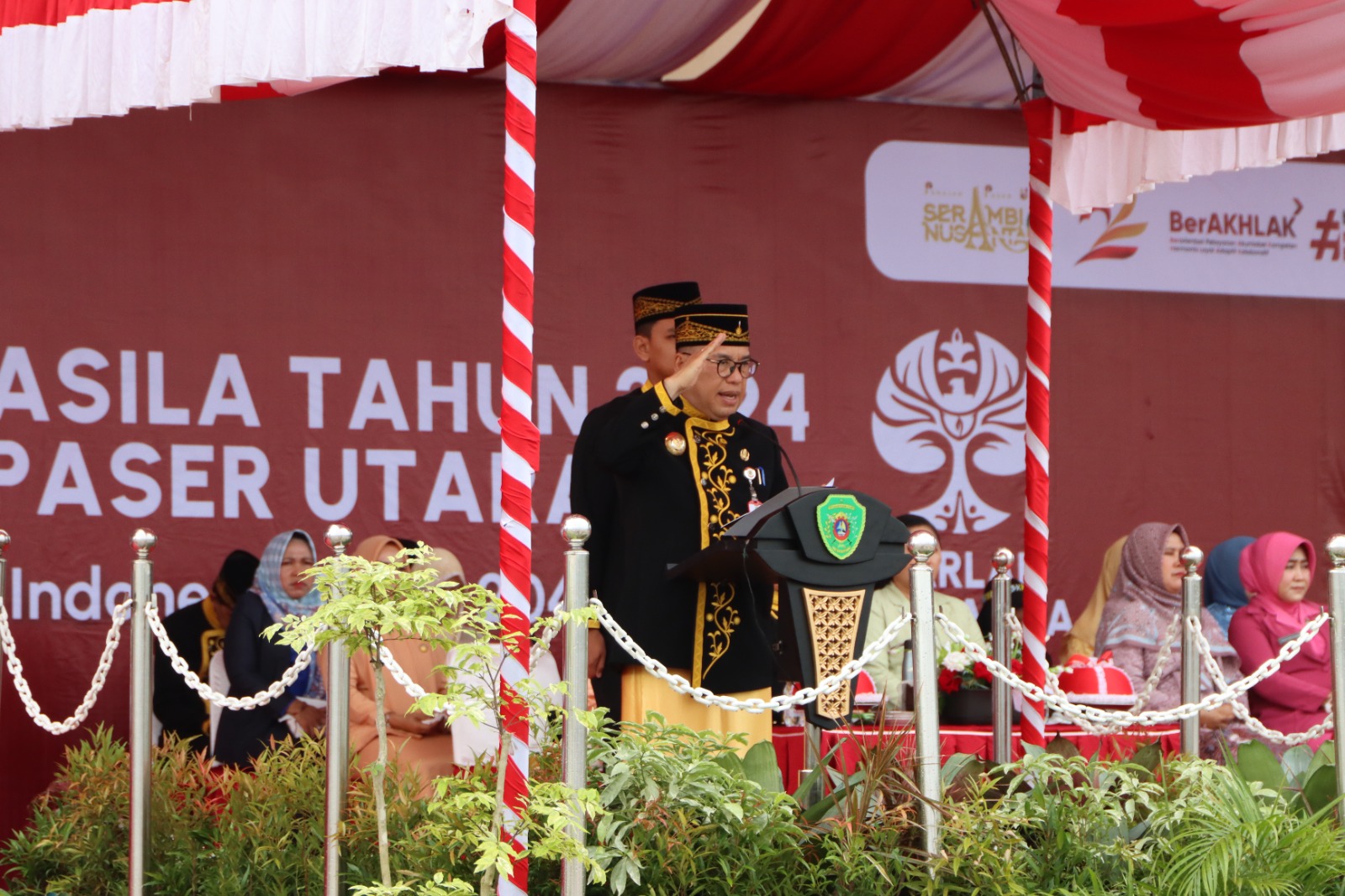 Pj. Bupati PPU saat membacakan pidato Kepala Badan Pembinaan Ideologi Pancasila RI menyampaikan dalam momentum yang bersejarah ini, dirinya mengajak komponen bangsa dimana pun berada untuk bahu membahu membumikan nilai-nilai Pancasila ke dalam setiap aspek kehidupan bermasyarakat, berbangsa dan bernegara.
