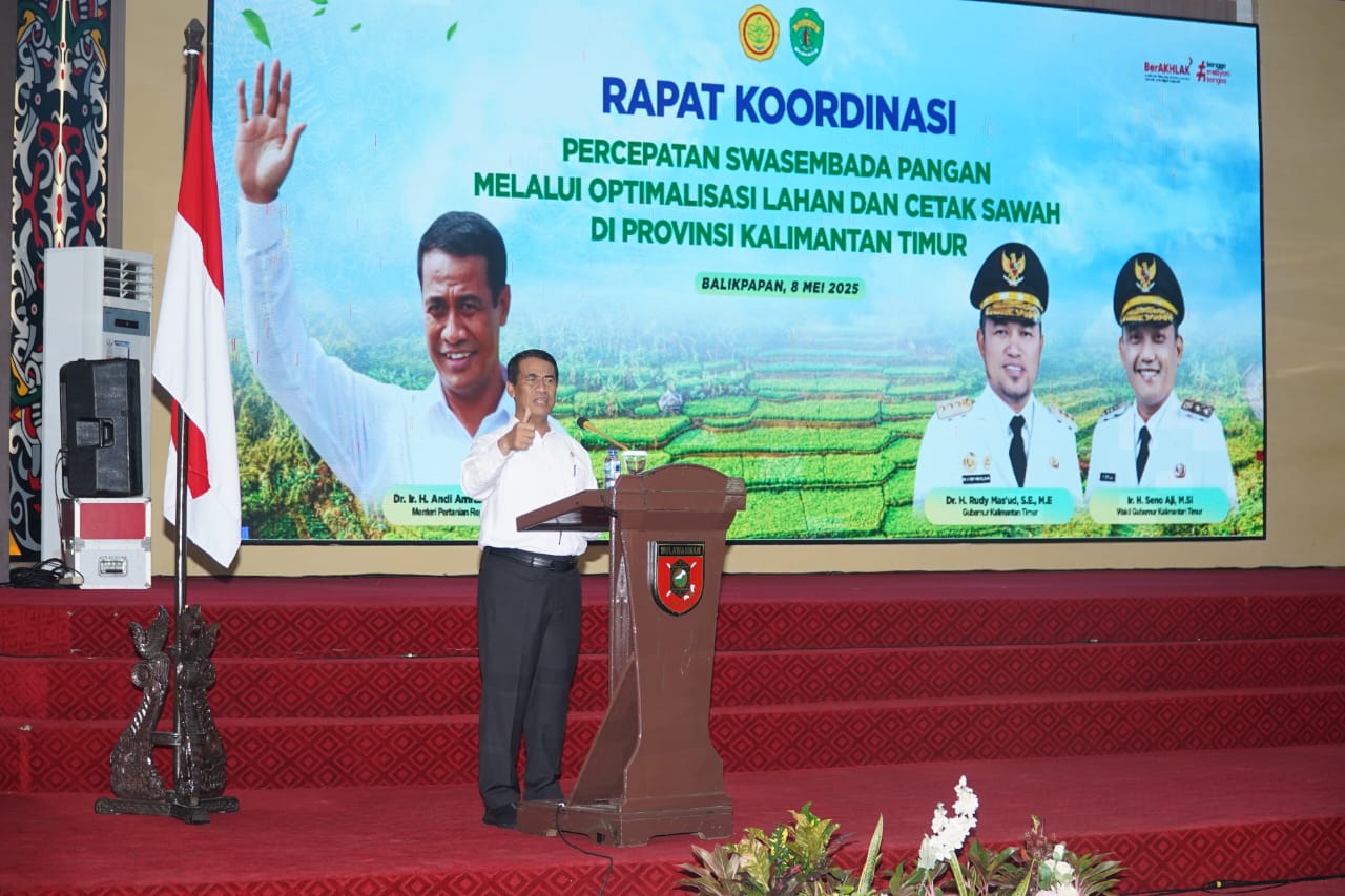 Balikpapan – Pemerintah pusat menaruh harapan besar pada Kalimantan Timur (Kaltim) untuk menjadi motor penggerak swasembada pangan nasional. Target ambisius ini ditegaskan oleh Menteri Pertanian (Mentan) Andi Amran Sulaiman dalam Rapat Koordinasi Percepatan Swasembada Pangan yang berlangsung di Makodam Mulawarman, Kamis (8/5/2025). Acara penting ini dihadiri oleh sejumlah tokoh kunci, termasuk Gubernur Kaltim Rudy Mas’ud, Wakil Gubernur Seno Aji, para Bupati/Wali Kota se-Kaltim, serta perwakilan dari TNI dan para penyuluh pertanian.