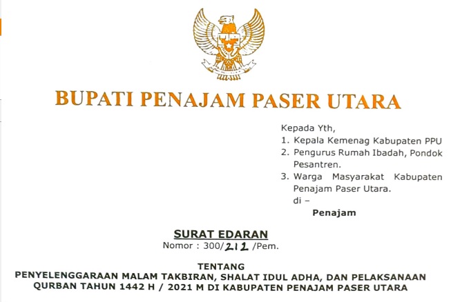 SURAT EDARAN BUPATI PENAJAM PASER UTARA Nomor : 300/212/PEM. tentang Penyelenggaraan Malam Takbiran, Shalat Idul Adha dan Pelaksanaan Qurban Tahun 1442 H / 2021 M di Kabupaten Penajam Paser Utara