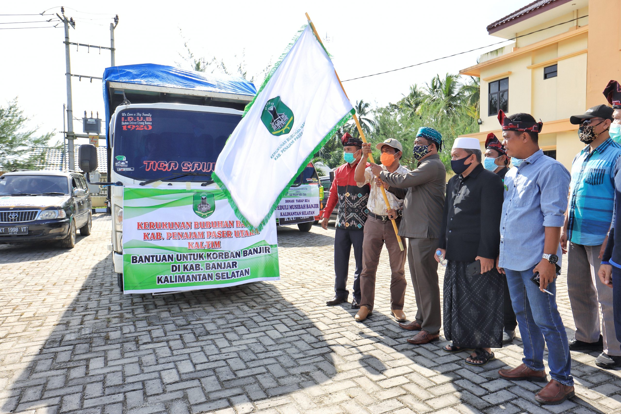PENAJAM – Wakil Bupati (Wabup) Kabupaten Penajam Paser Utara (PPU) Ir Hamdam melepas pemberangkatan dua rombongan armada yang menyalurkan bantuan terdampak banjir Provinsi Kalimantan Selatan (Kalsel) di halaman Kantor Camat Waru, Sabtu (23/1/2021). Bantuan tersebut di inisiasi Keluarga Kerukunan Bubuhan Banjar (KKBB) dan Pengurus Cabang Nahdlatul Ulama (PCNU) Kabupaten PPU.